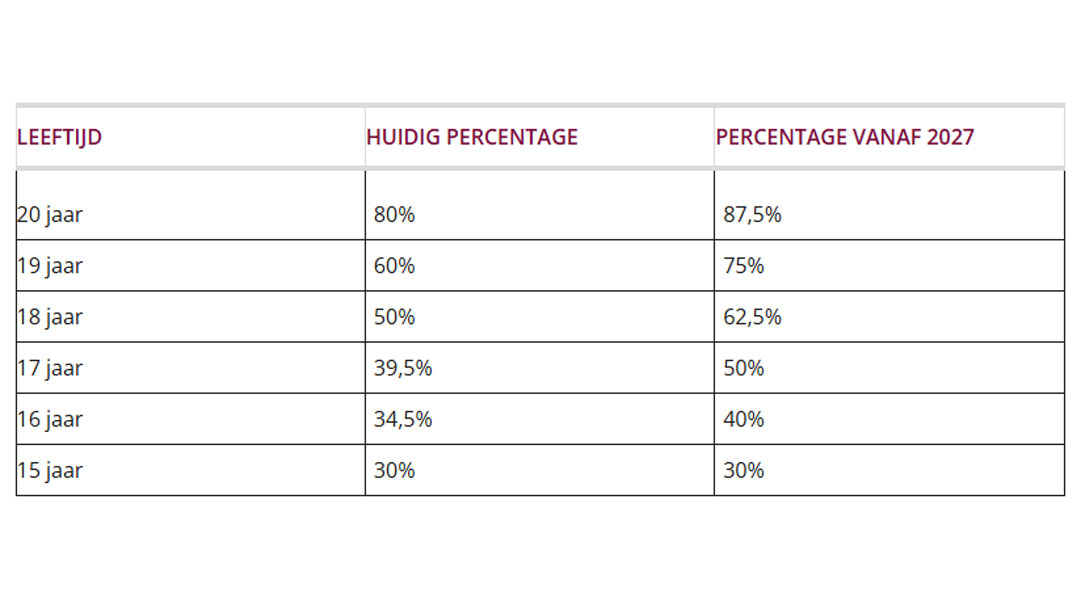 De verhoging geldt voor jongeren van 16 tot en met 20 jaar. Per leeftijdscategorie stijgt het percentage van het reguliere minimumloon als volgt: